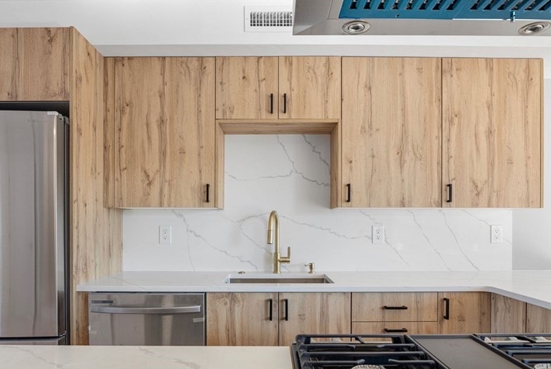 Kitchen: Custom modern cabinetry with quartz countertops and stainless steel appliances.