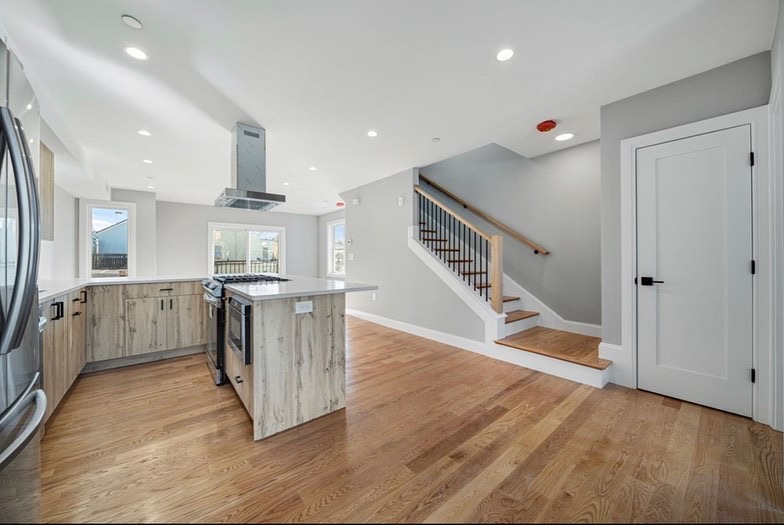 The units feature an open-concept layout with abundant natural light, connecting the living, dining, and kitchen areas seamlessly. We installed premium hardwood flooring throughout and designed a chef-inspired kitchen with custom cabinetry, quartz countertops, and a central island with seating. The project also included modern staircases with iron balusters and energy-efficient systems.